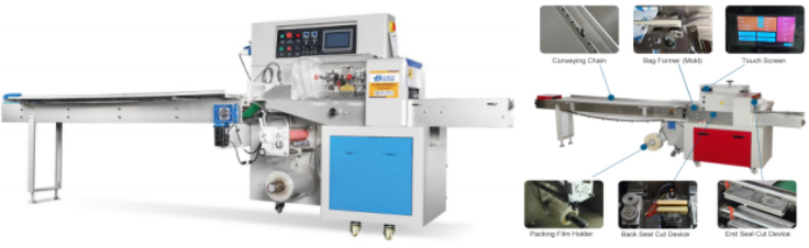 Horizontal Pillow packaging machine widely applied for various kinds of regular objects .like Disposable glove , Disposable face mask, Household glove , Labor glove ,Work glove ,Nitrile glove ,Latex Glove ,Vegetable ,and so on .