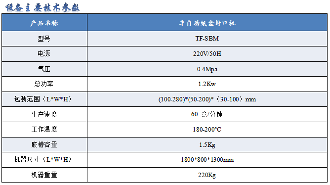 2.人(rén)工裝好物料放至輸送帶,機(jī)械自動上膠、封口,大小規格(gé)可調節;3.機器使用膠量大約(yuē)是手工封盒膠的1/3,膠水使用量(liàng)極少(shǎo);