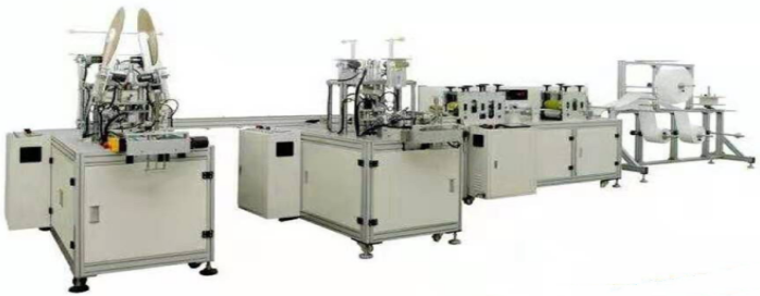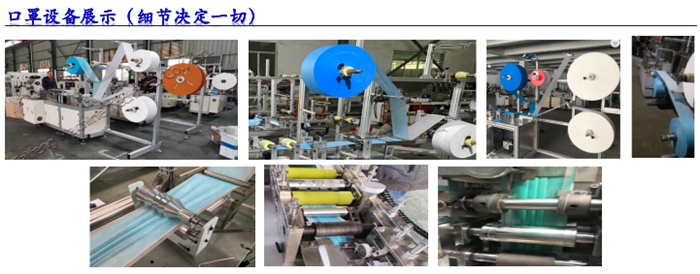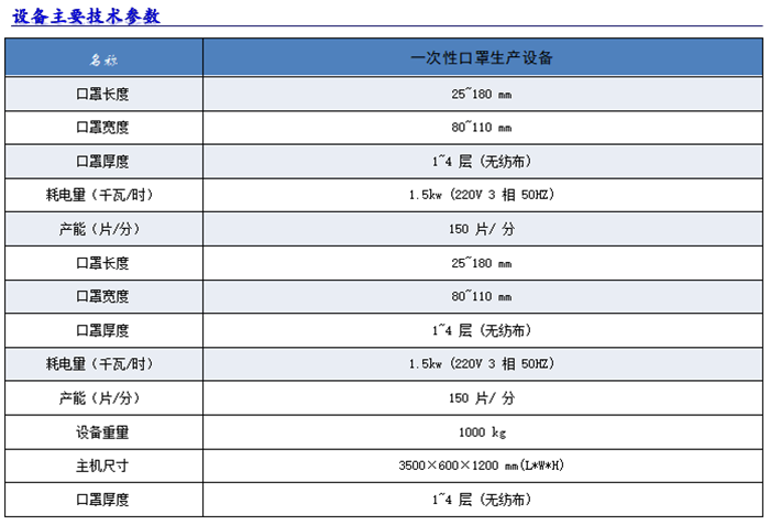 1)本機可(kě)生產1--4層無紡布本體口罩。規格可調,口罩厚度在一(yī)定範圍內可調,鼻梁線長度任意可調,在更換模具的情況下可生產任意長度的非標準的口罩,可以(yǐ)生產單、雙(shuāng)鼻線的口罩。包線橡皮筋放置在輸送帶盒內,口罩兩端的橡(xiàng)皮筋自動(dòng)輸送剪切(qiē),焊(hàn)接(jiē)牢固,一次性由機器完成點帶的設備,產量高,廢品率低,容易操作,外觀采(cǎi)用鋁合金結(jié)構;